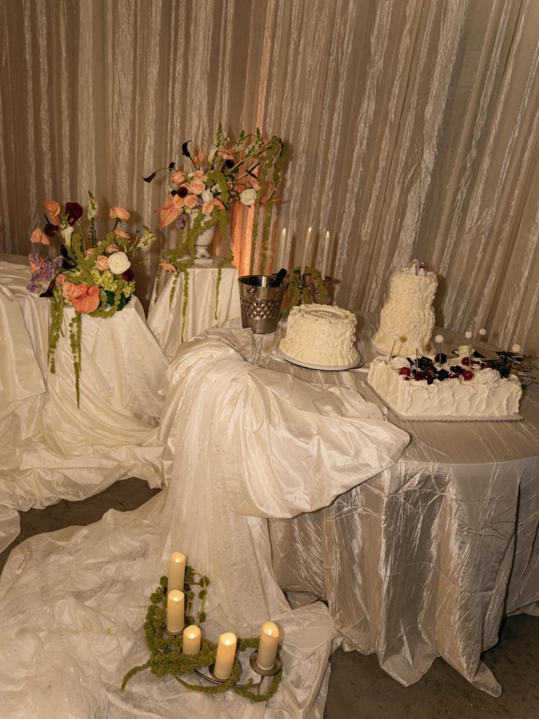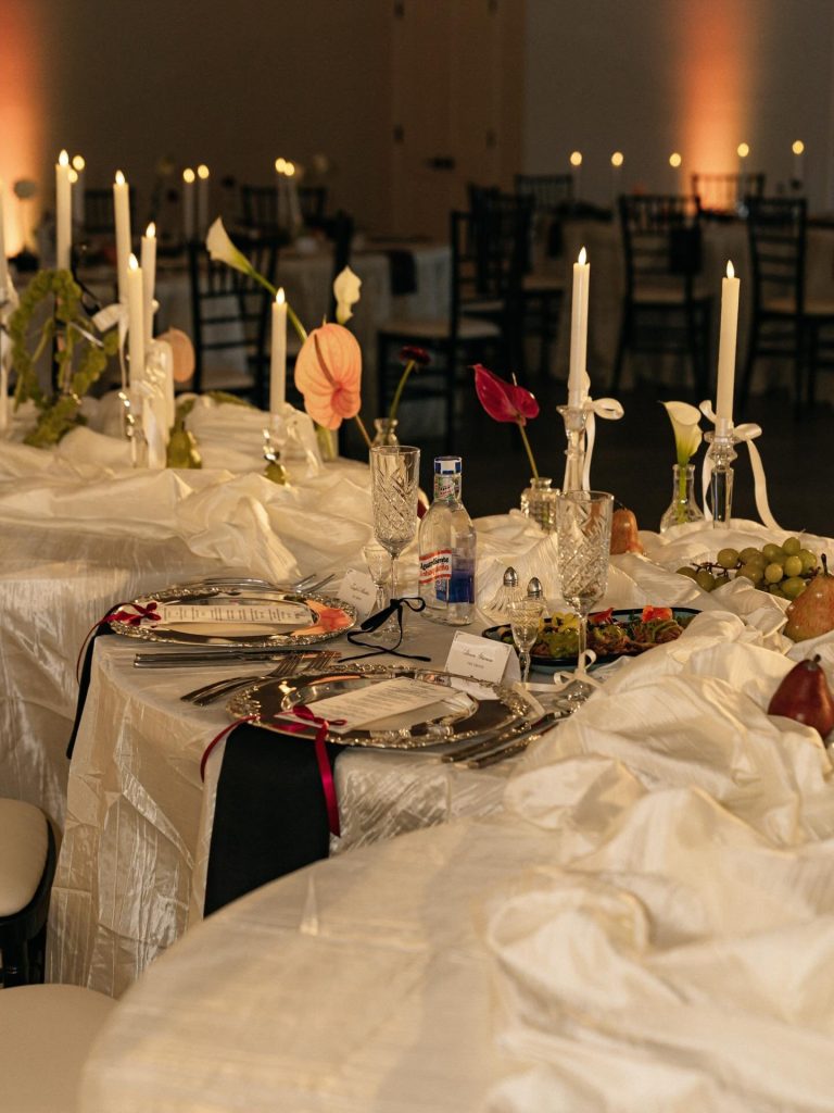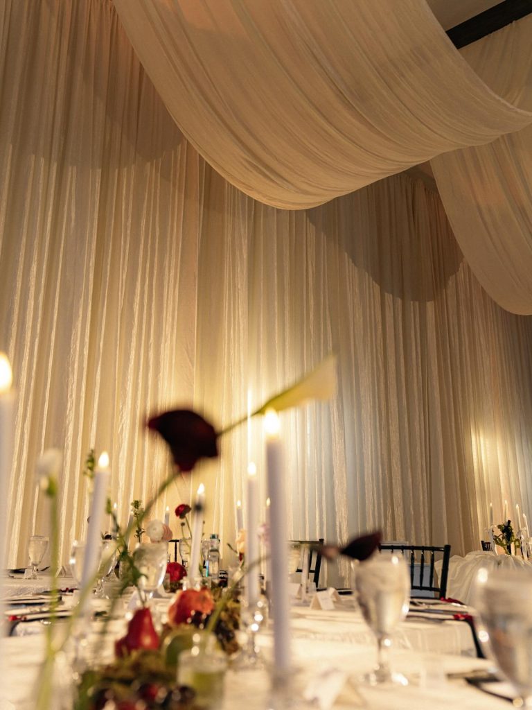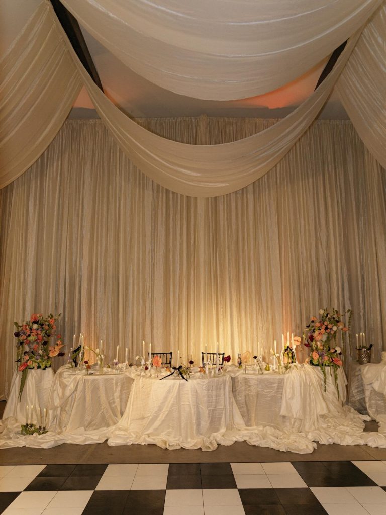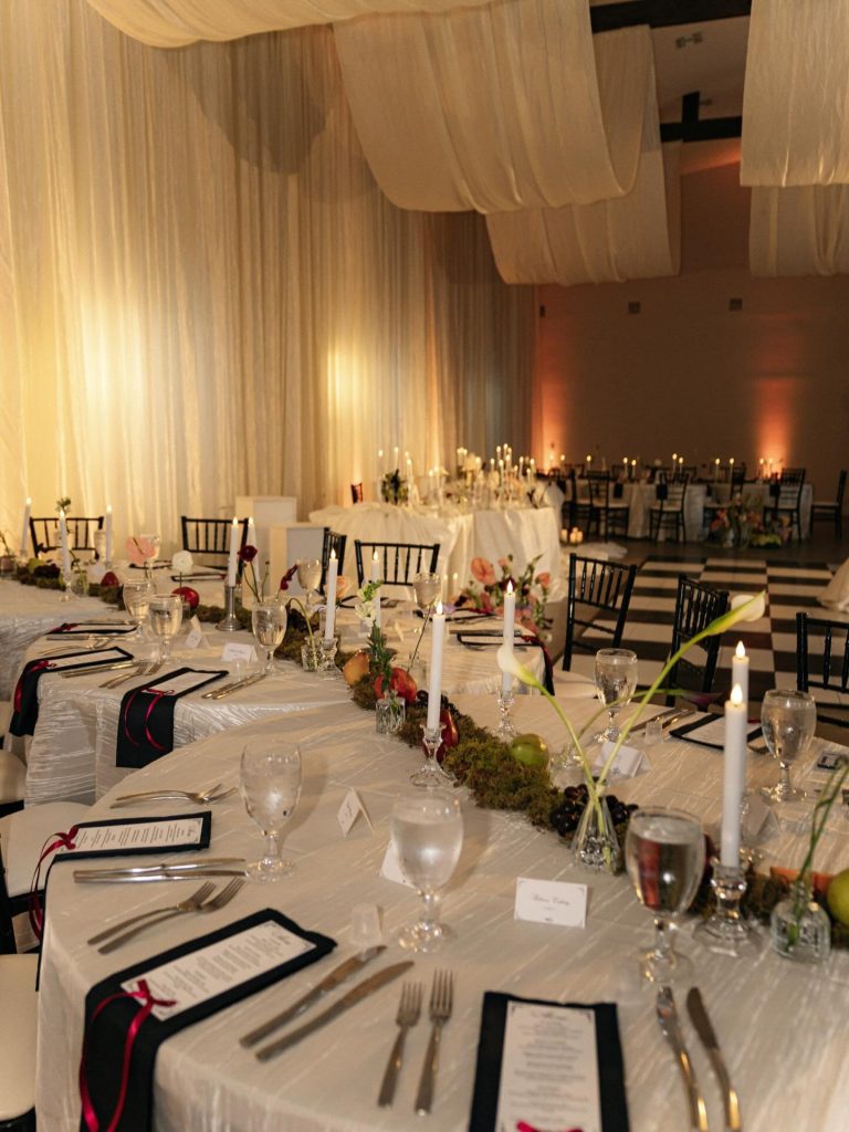 Taylor and Steven’s wedding day was the perfect blend of softness, texture, and elevated design—where every detail worked together to create an atmosphere that felt both romantic and unforgettable. Taylor’s gown from Truly Forever Bridal set the tone with its timeless elegance, beautifully complemented by the soft, glowing beauty look created by Posh Bridal Team. From the start, every element felt cohesive, refined, and effortlessly stunning. The reception design truly brought their vision to life. On The Move Wedding & Event Rentals transformed the space with sweeping ivory drapery across the ceiling and walls, creating depth and an intimate, romantic feel. A bold black and white checkered dance floor paired with black chiavari chairs added contrast, while serpentine tables draped in shimmering ivory fabric were finished with single stems, moss, fresh fruit, and cascading amaranthus for a rich, textural look. Every detail was intentional, layered, and beautifully executed. Cheers to the newlyweds!