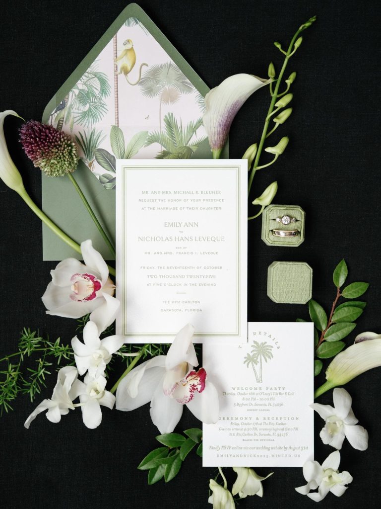 The LeVeque’s celebration was the perfect blend of modern structure and effortless elegance. With earthy greens, crisp whites, and pops of purple, their day felt fresh, refined, and full of Florida sunshine.