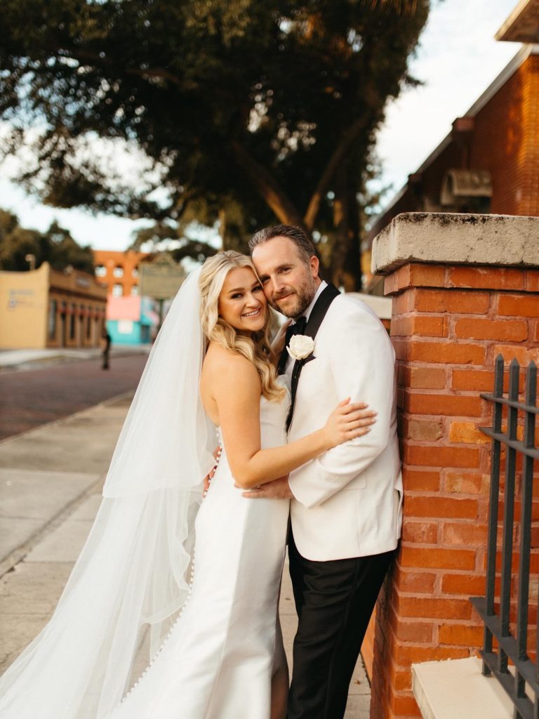 Newlywed couple walking hand-in-hand past modern Tampa waterfront buildings