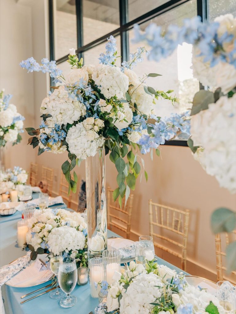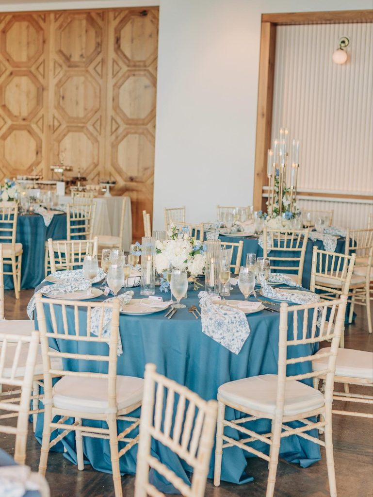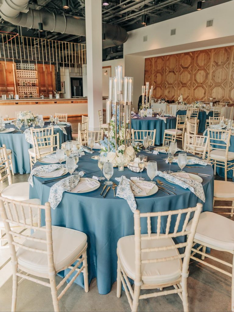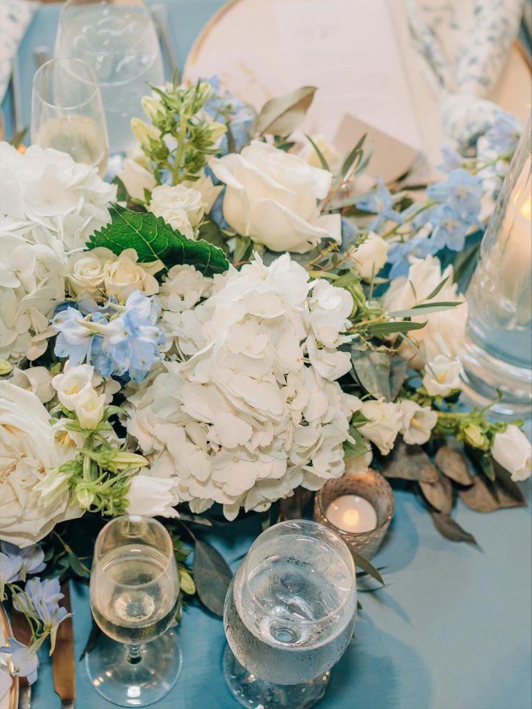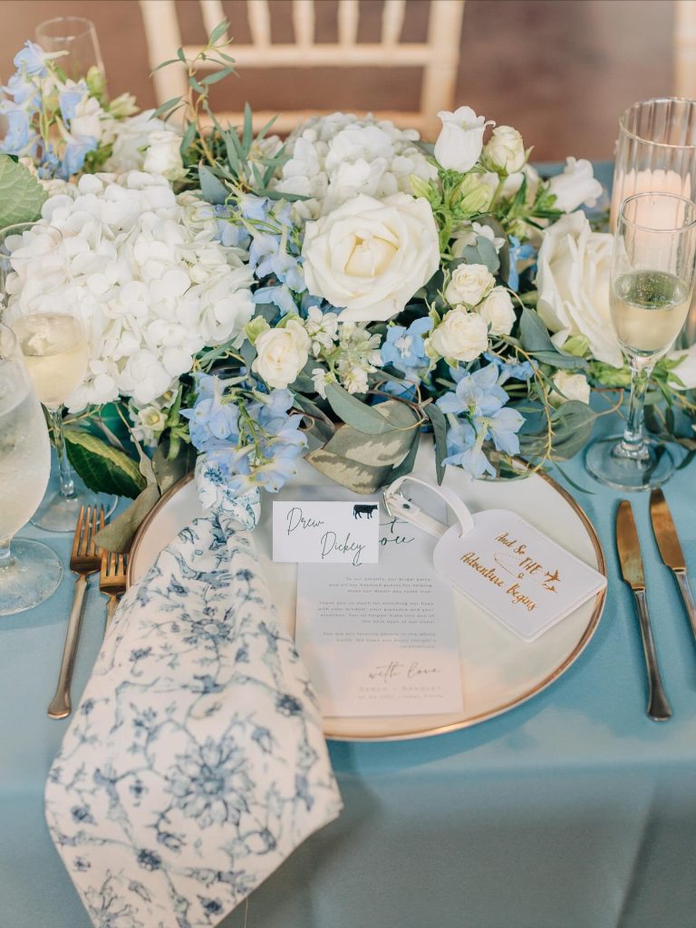 Sarah & Brad’s wedding day at Hyde House Public Studio was a stunning celebration of soft sophistication and heartfelt romance. Soft blue tones set the mood for the celebration, creating an atmosphere that beautifully complemented the venue’s contemporary aesthetic. From the floral details to the table settings, every piece flowed together with effortless charm.