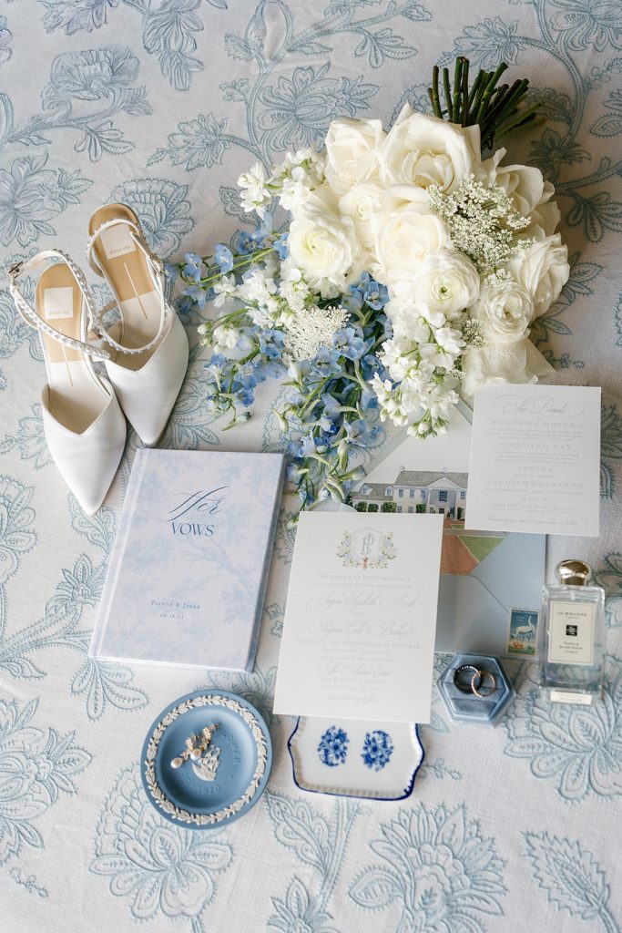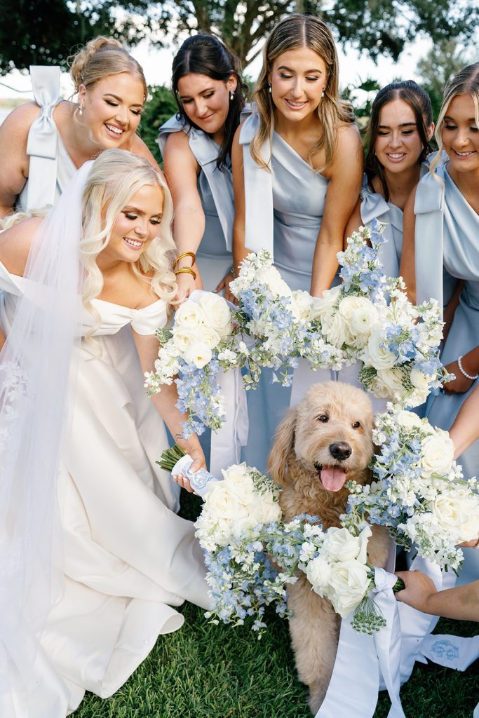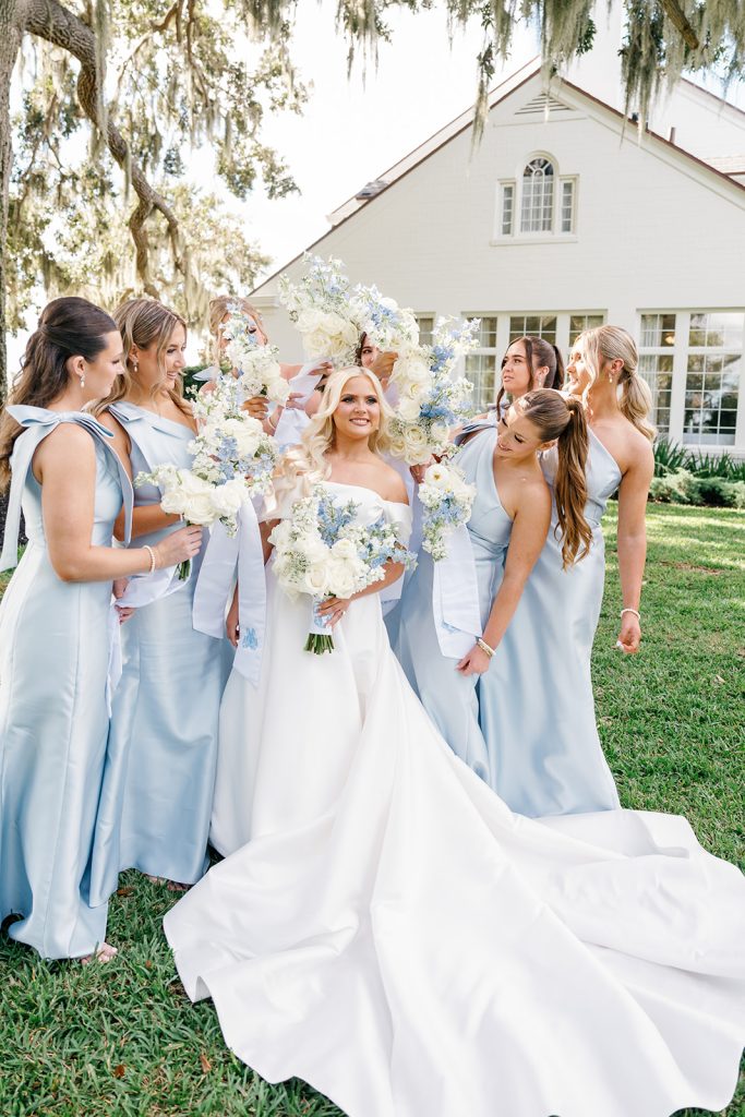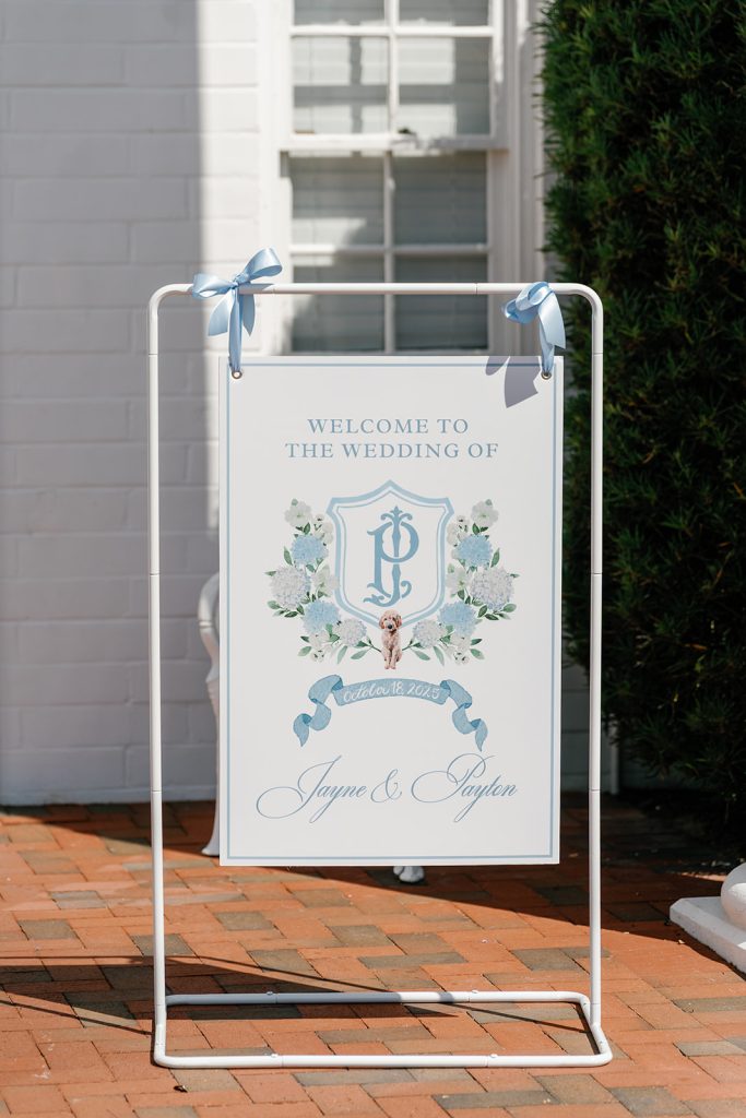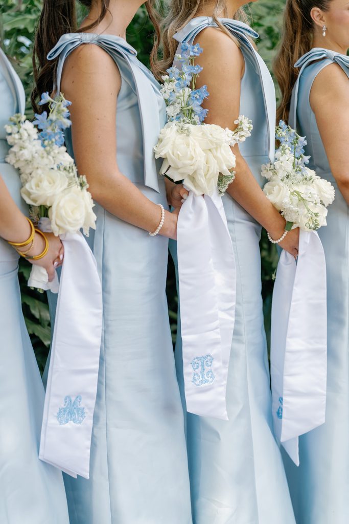 Bridesmaids wore soft blue gowns adorned with statement bows, carrying cascading bouquets tied with custom embroidered monogram ribbon streamers. That crest became a defining design element of the day, thoughtfully woven throughout the celebration — from bouquet wraps to the welcome signage and hand-painted dance floor — creating a cohesive story that felt both personal and refined.