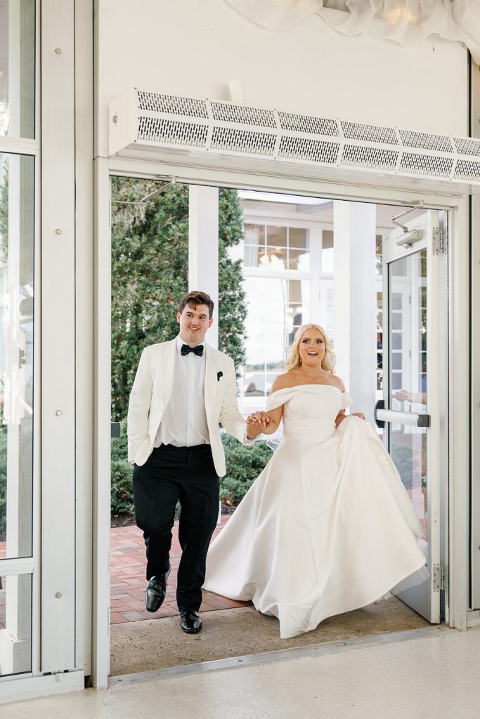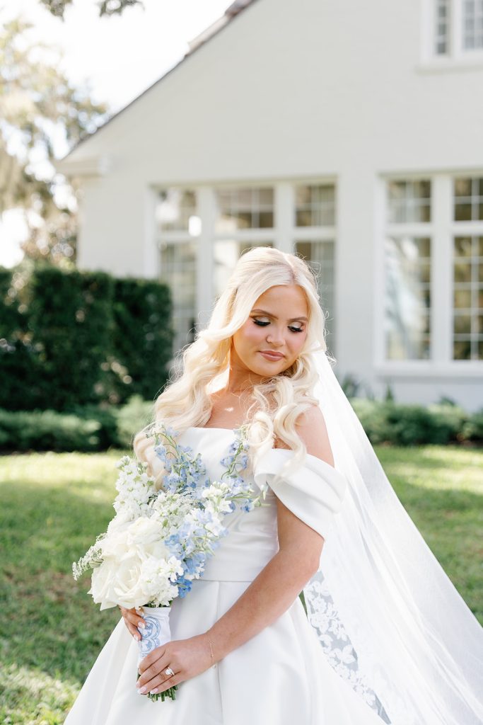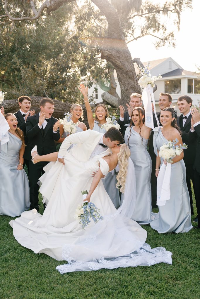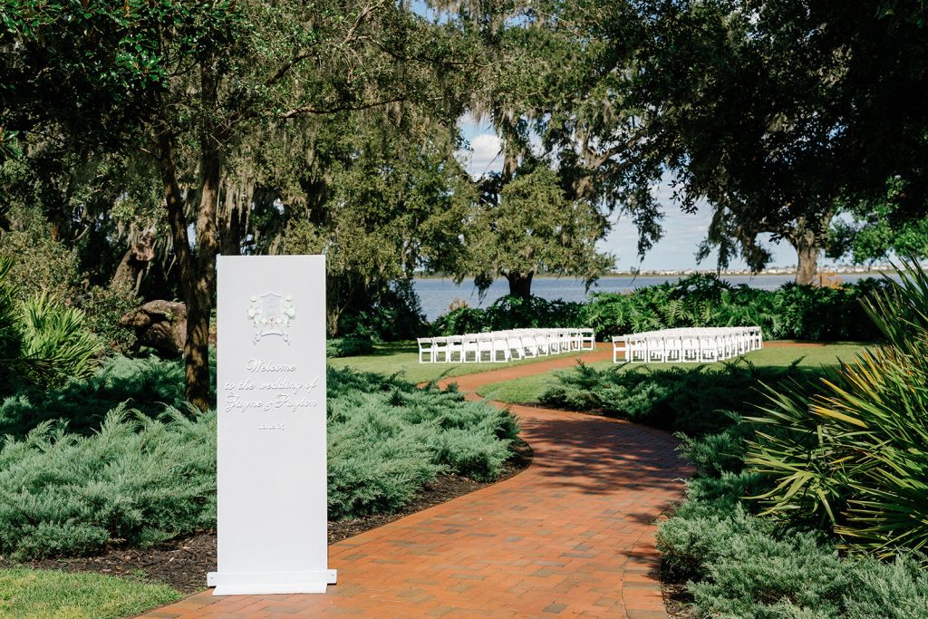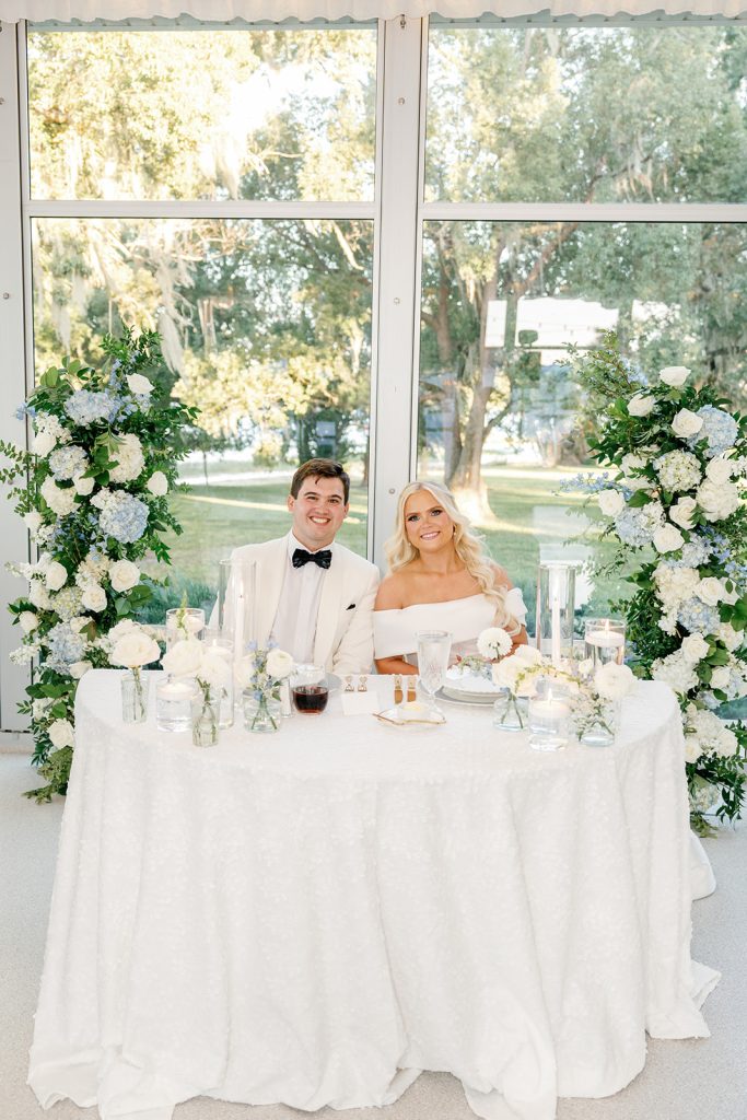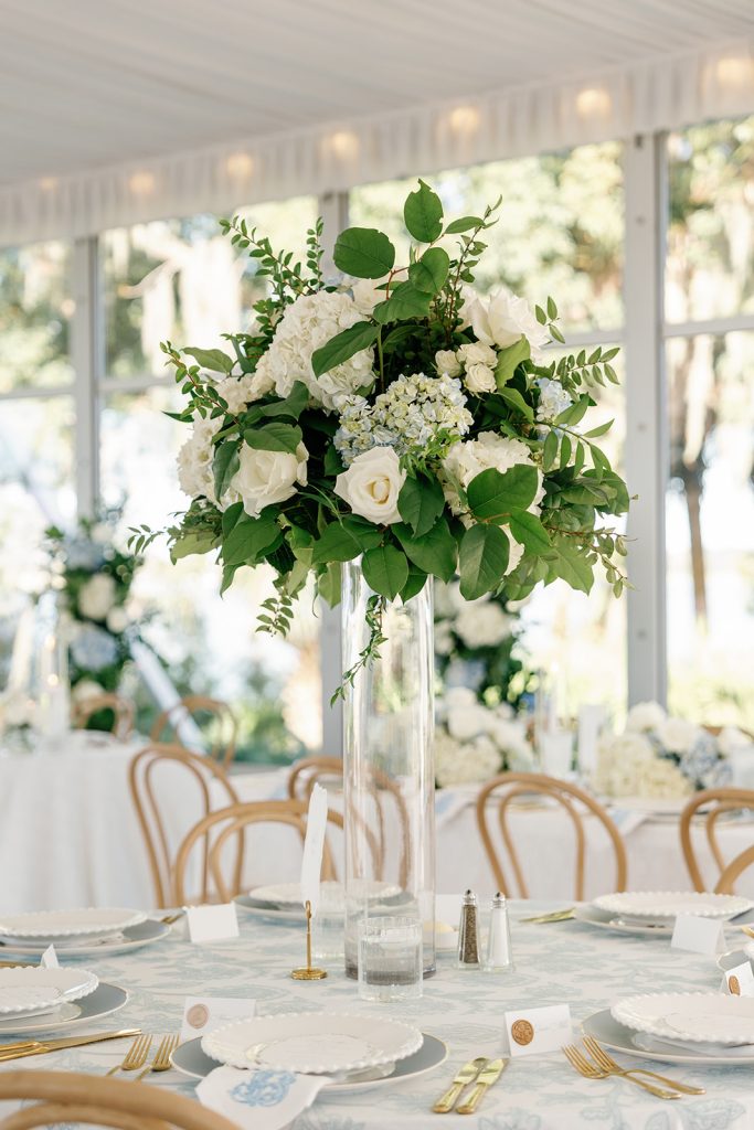 Jayne and Payton envisioned a wedding that felt timeless yet fresh, elevated without feeling overly formal. A palette of powder blue, crisp white, and layered greenery set the tone for the entire celebration. Bustle & Bloom Weddings, who led both wedding planning and floral design, brought that vision to life through lush white hydrangeas, garden roses, and soft blue blooms woven throughout the ceremony and reception. The ceremony space, set along a brick aisle beneath sweeping oaks, was framed by abundant florals that felt organic yet intentional, allowing the waterfront backdrop to shine.
