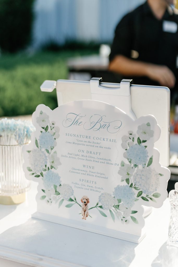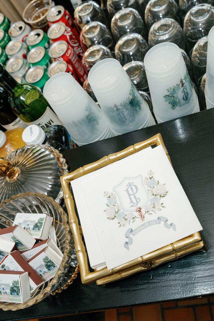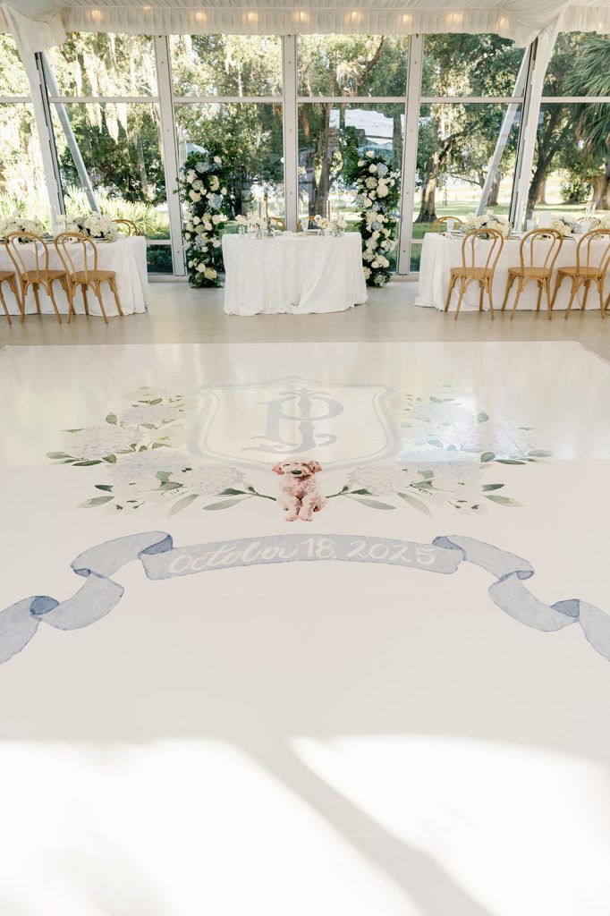 The custom dance floor became an instant focal point. Painted in soft watercolor florals with Jayne & Payton’s crest at its center and featuring a sweet illustrated nod to their beloved dog, it set the stage for a night filled with celebration. That same playful personalization appeared on cocktail napkins and reception details, creating continuity from ceremony to sendoff.