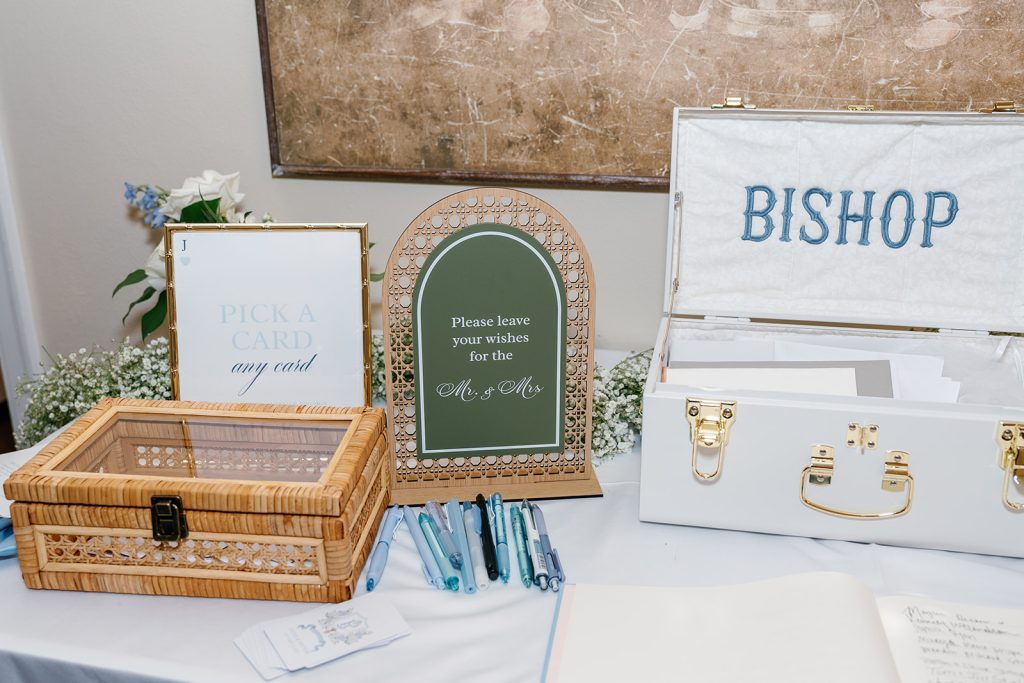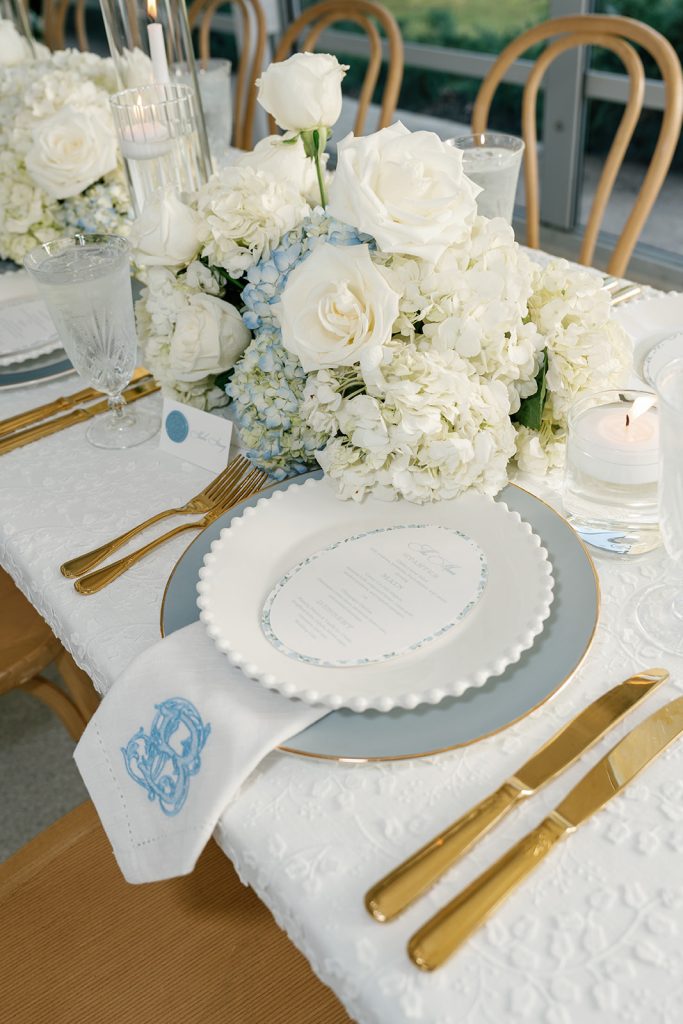 Inside the tented reception, layered textures and personalized details elevated each table. Pale blue patterned linens paired with gold flatware and delicate glassware created a setting that felt classic and warm. Monogrammed napkins and custom menu inserts added a subtle heirloom touch that guests couldn’t help but notice. The personalization extended into the guest experience as well. Instead of a traditional guest book, Jayne & Payton invited guests to select custom cards adorned with their crest and leave handwritten wishes for the newlyweds. The thoughtful detail not only echoed the wedding’s signature motif but created a meaningful keepsake they will treasure long after the celebration.