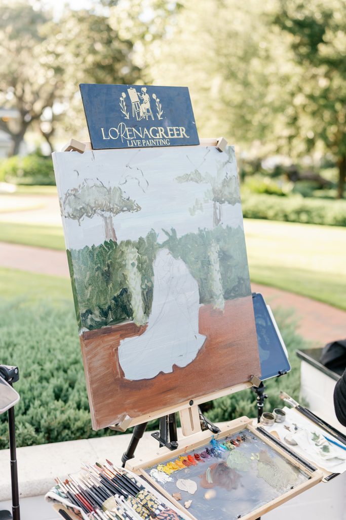 One of the most unforgettable elements of the evening was the live painter, who captured the ceremony scene in real time as guests looked on during cocktail hour. Watching the canvas evolve stroke by stroke added an interactive, artful dimension to the celebration. More than entertainment, it became a meaningful keepsake and future heirloom preserving not just how the day looked, but how it felt.